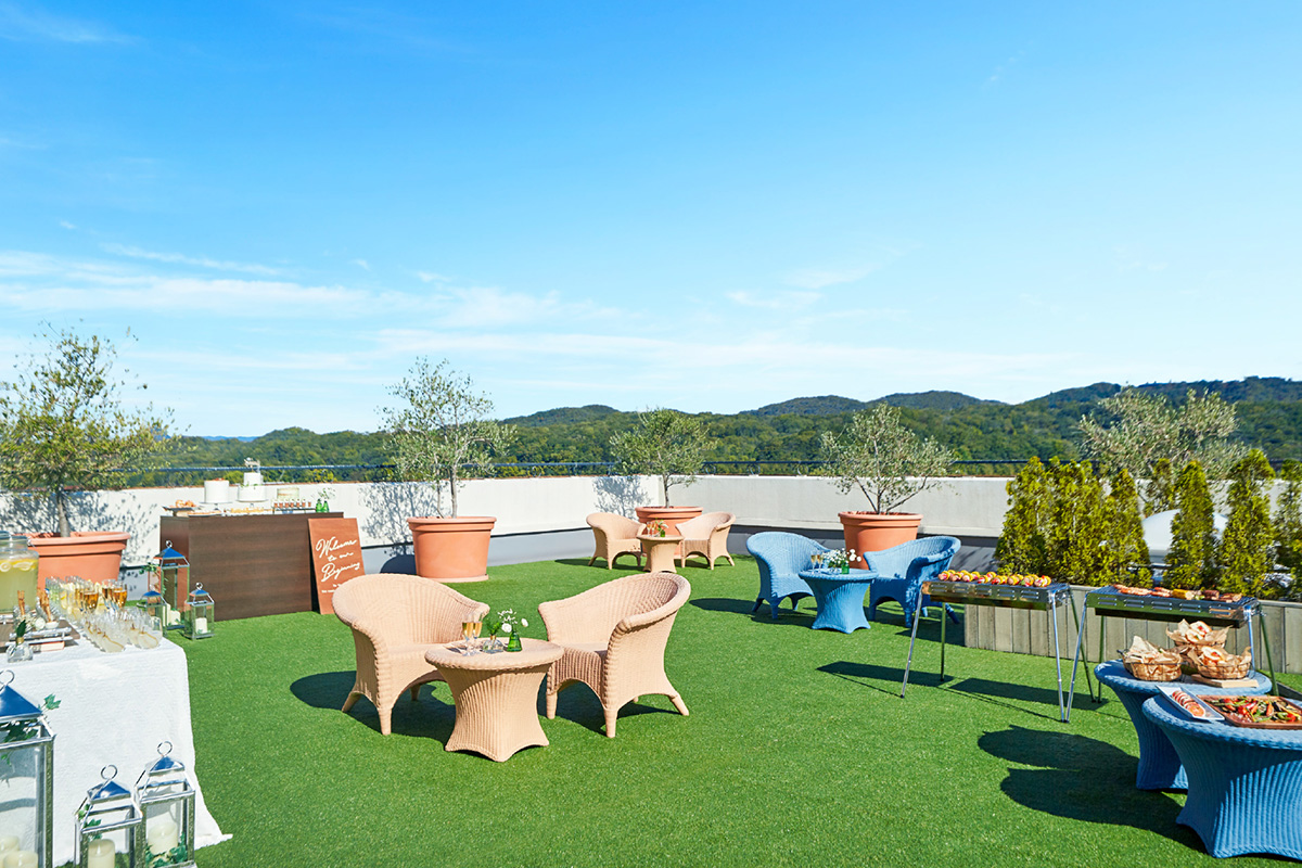 会食会場屋上ガーデンとつながる、最大120名様着席可能なパーティースペース。広々空間でゲストとゆったりした時間をお過ごしいただけます。