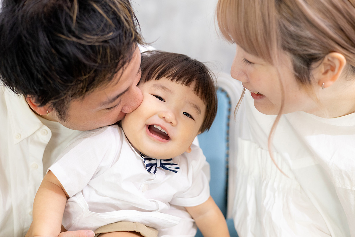 広々スタジオで、三世代ショットもゆったりおじいちゃんおばあちゃんも一緒に、家族みんなで記念の一枚を。人数が多くてもゆったり撮影できるので、多世代でのご来店も安心です。