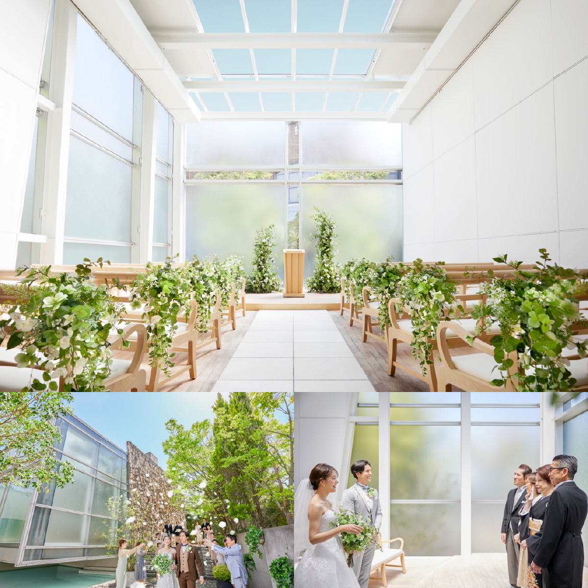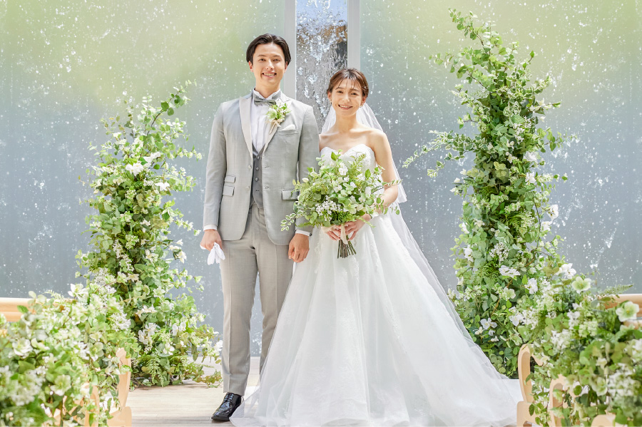 陽光と清らかな水に包まれたチャペルで、新郎新婦が純白の誓いを交わす。 十字のガラスウォールが光を受け、幻想的な雰囲気で、ゲストとの温かなつながりを感じるセレモニー。