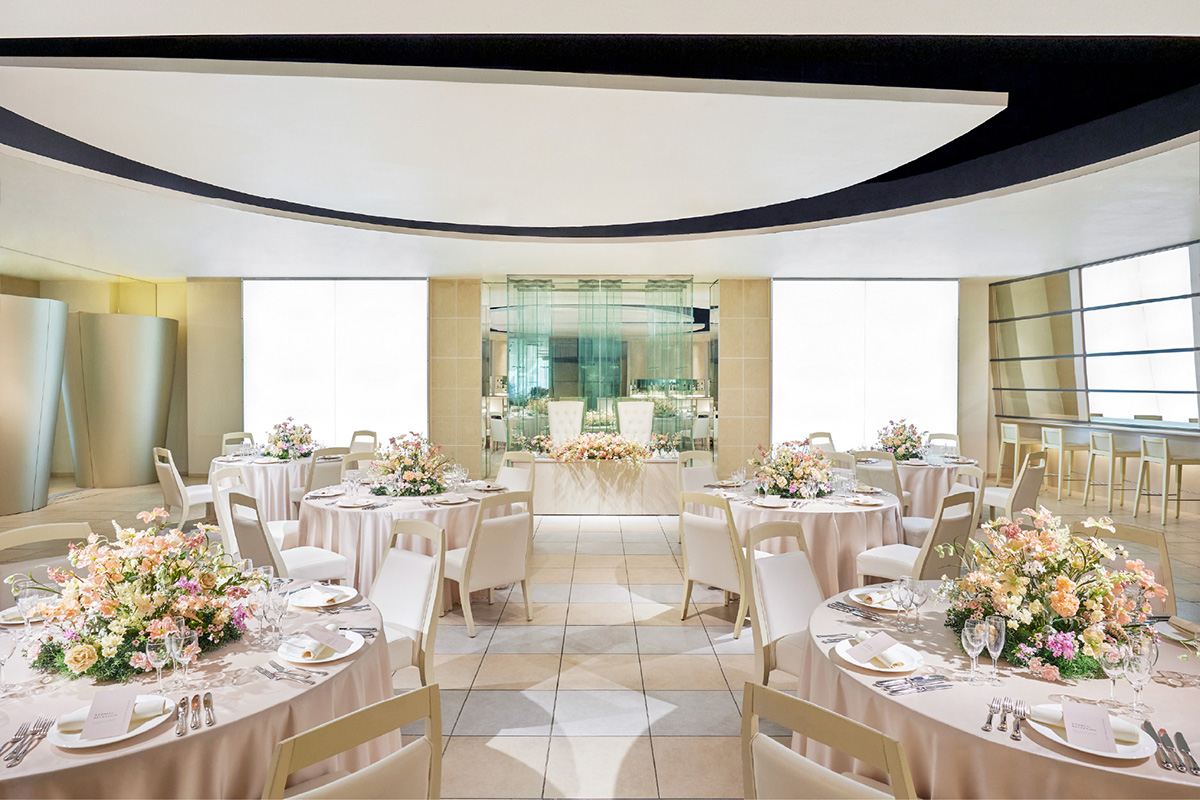 会食会場屋上ガーデンとつながる、最大120名様着席可能なパーティースペース。広々空間でゲストとゆったりした時間をお過ごしいただけます。