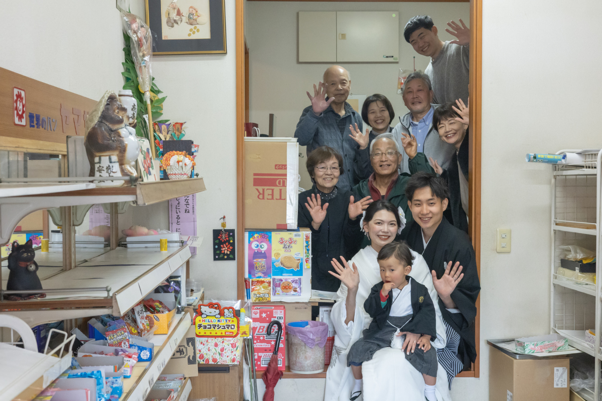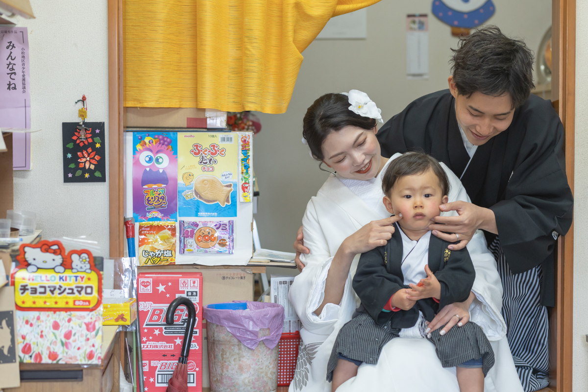 幼い頃から慣れ親しんだ、祖父母様が営まれる駄菓子屋での和装撮影を行いました。